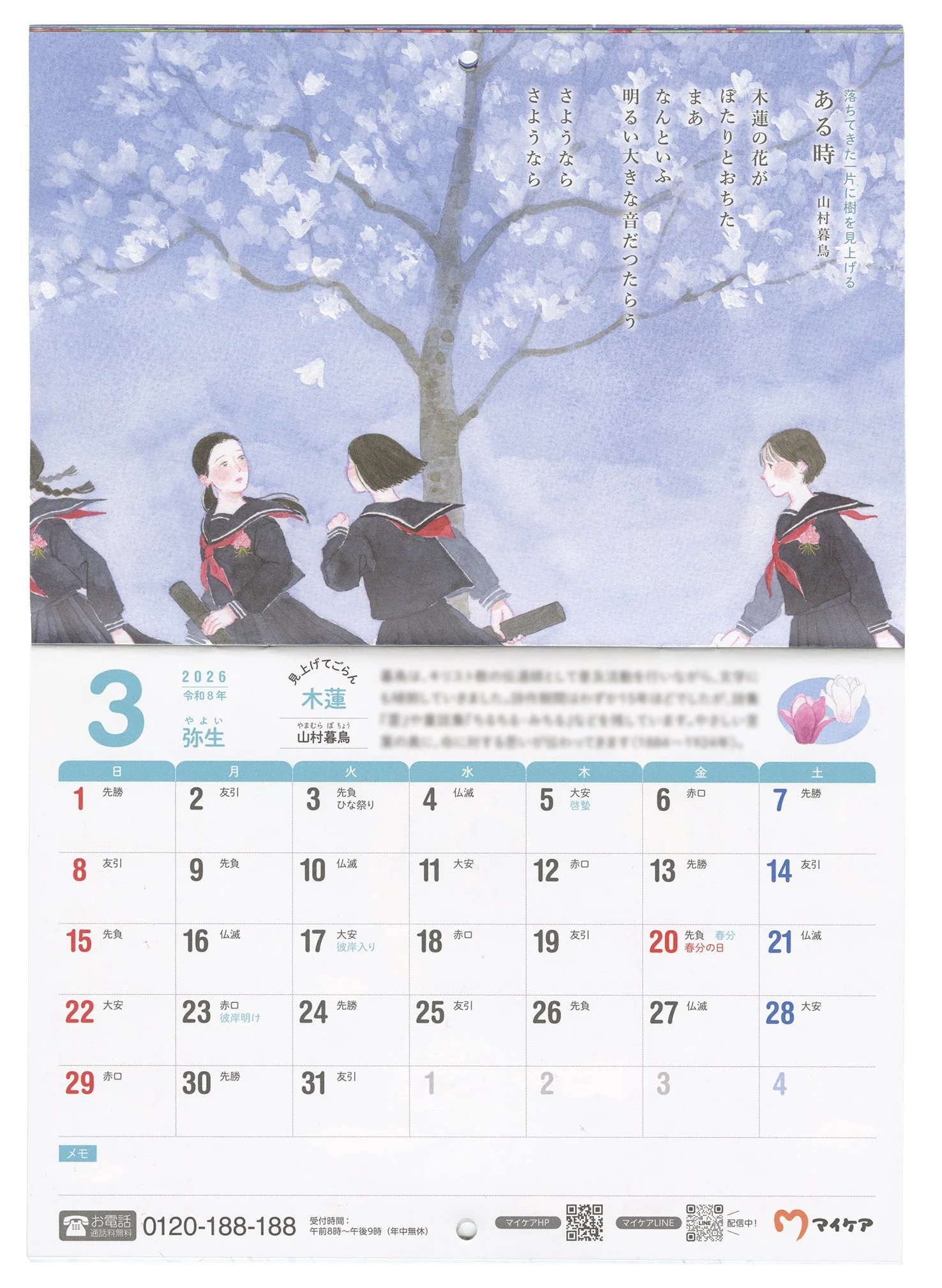 有限会社マイケアの2026年度カレンダー用挿絵、3月・5月・11月分を担当しました。