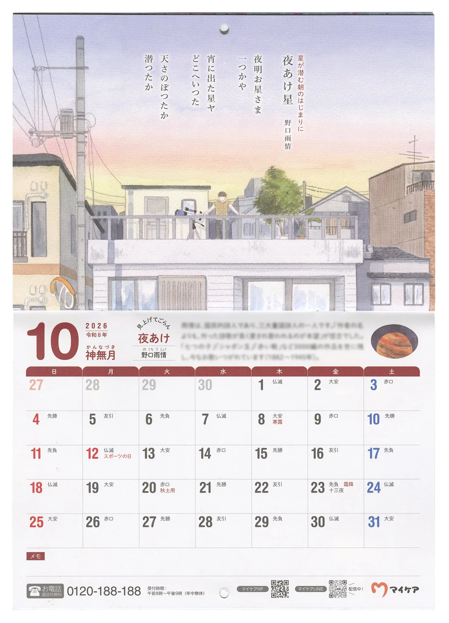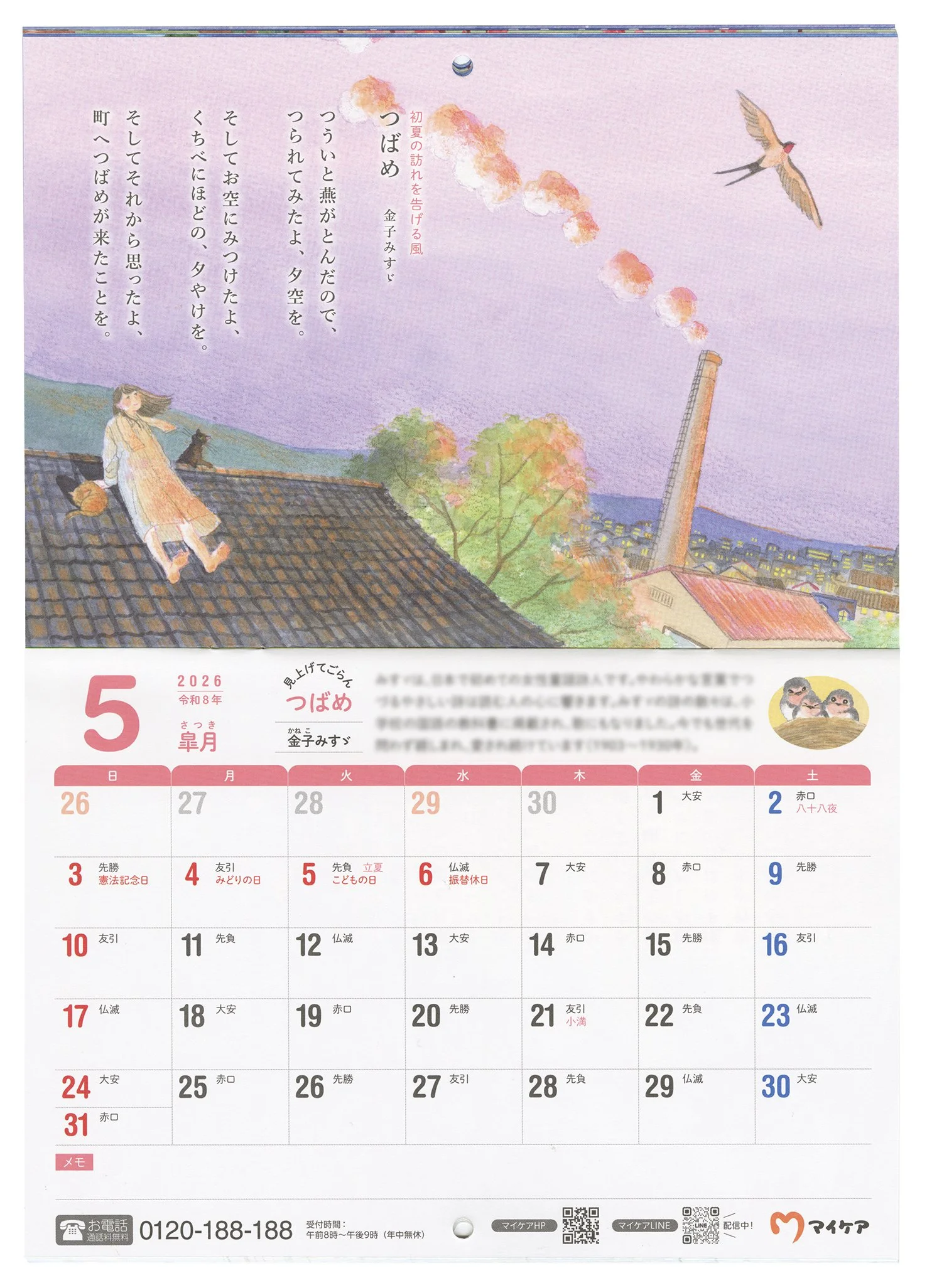 有限会社マイケアの2026年度カレンダー用挿絵、3月・5月・10月分を担当しました。